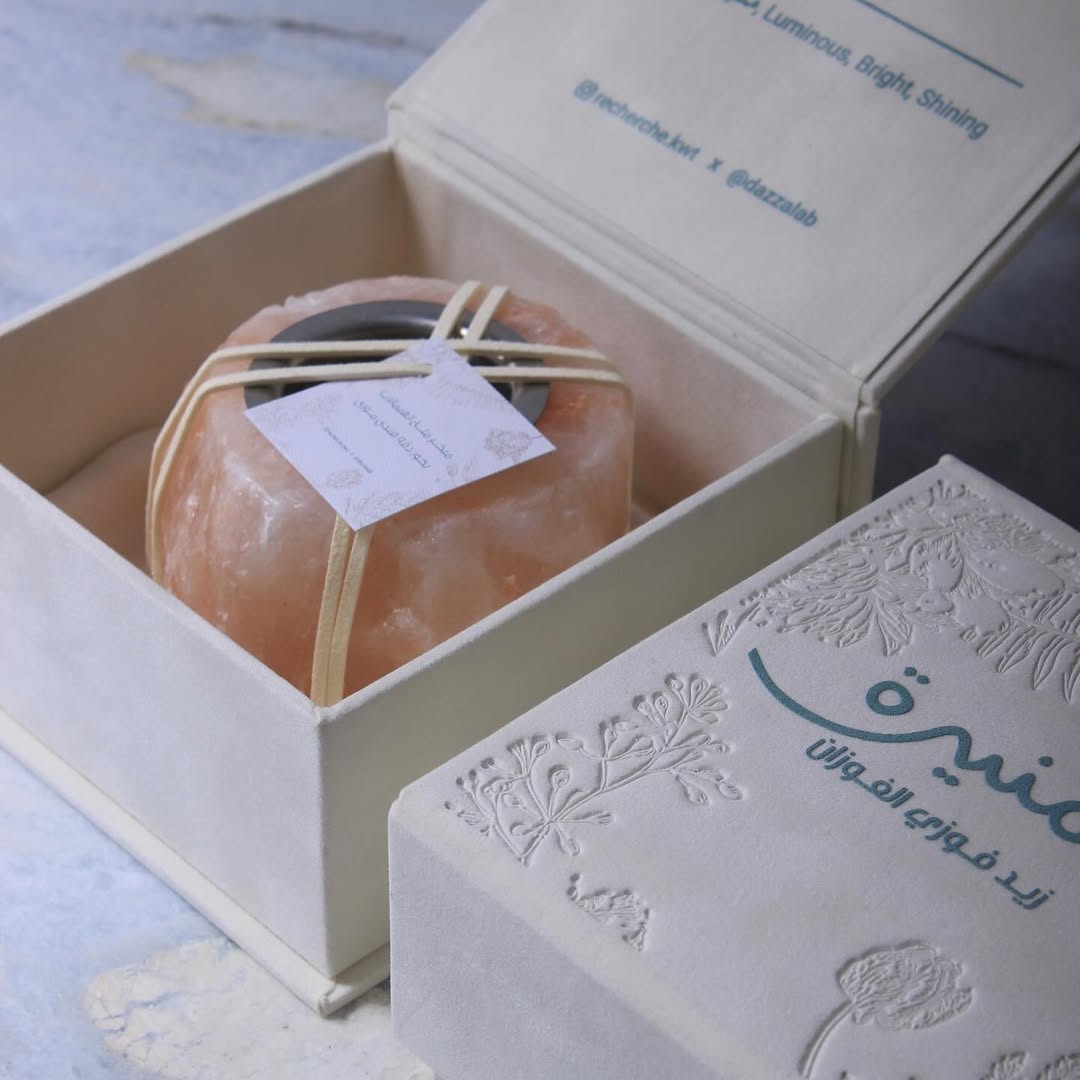 Make your special occasions unforgettable with our luxurious velvet box with Dazza lab Himalayan salt mubkhar.