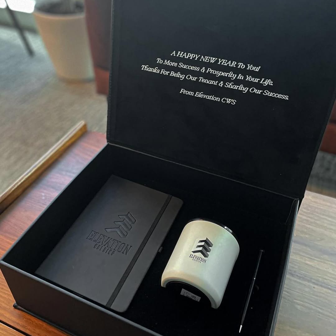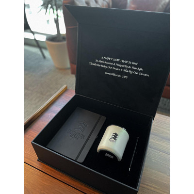 This gift set is perfect for any occasion for clients and includes a notebook, a mug, and a pen.